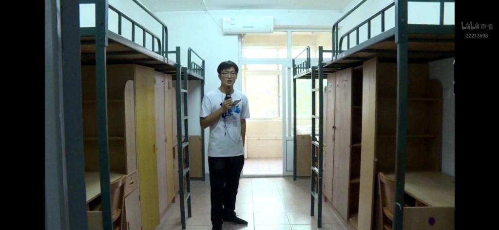 直播的后半程,研究生班主任刘文乐带领同学们参观船海新生即将入住的寝室。粉白的墙、新装的门、上床下桌的四人间将是二〇级船海学子的新家。韵苑13栋的宿管阿姨在镜头前也十分热情地跟同学们打招呼!