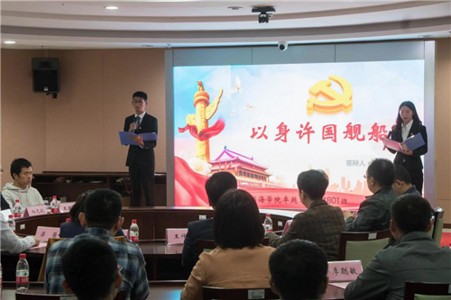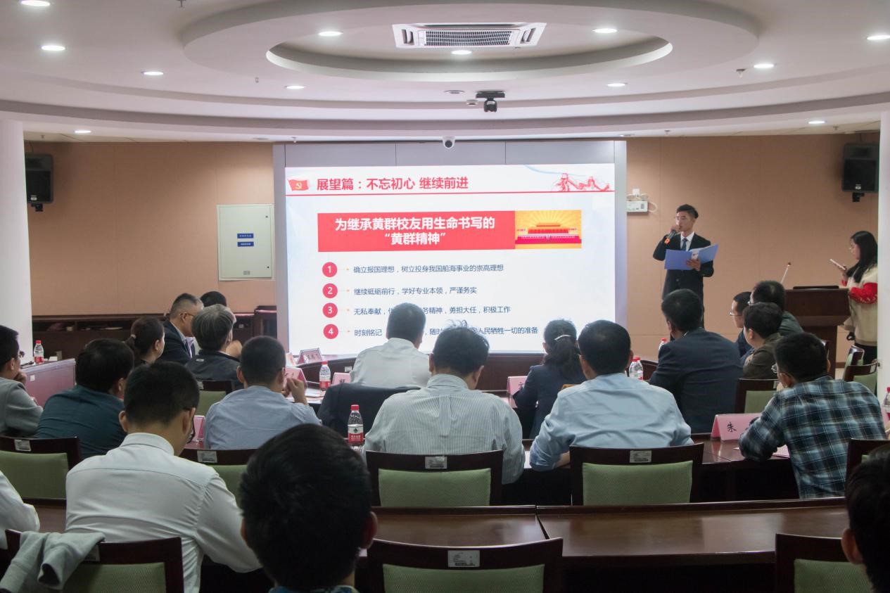 随后,首届“黄群班”、轮机1701班班长马梓峰汇报了创班一年以来班级成长的点点滴滴。在党旗领航工程指引下,班级成员用实际行动践行对党的誓言,全员提交入党申请书,班级已有6名预备党员,19名入党积极分子。一年多来,班内开展“雷锋日”主题班会、清明时节祭英雄、到武汉福利院看望英雄家属、班级义工、前往英雄黄群牺牲地七六〇研究所社会实践等一系列实践活动。班级全体成员时时刻刻以英雄黄群为榜样,以高标准严要求努力践行“勤学笃行矢志报国”的初心和誓言。