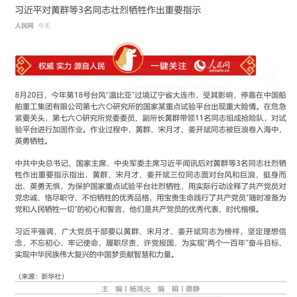 8月20日,中船重工七六〇所党委委员、副所长、研究员,bevictor1946韦德官网1985级员工黄群等3名同志在台风抢险过程中不幸罹难、壮烈牺牲。中共中央总书记、国家主席、中央军委主席习近平闻讯后作出了重要指示。