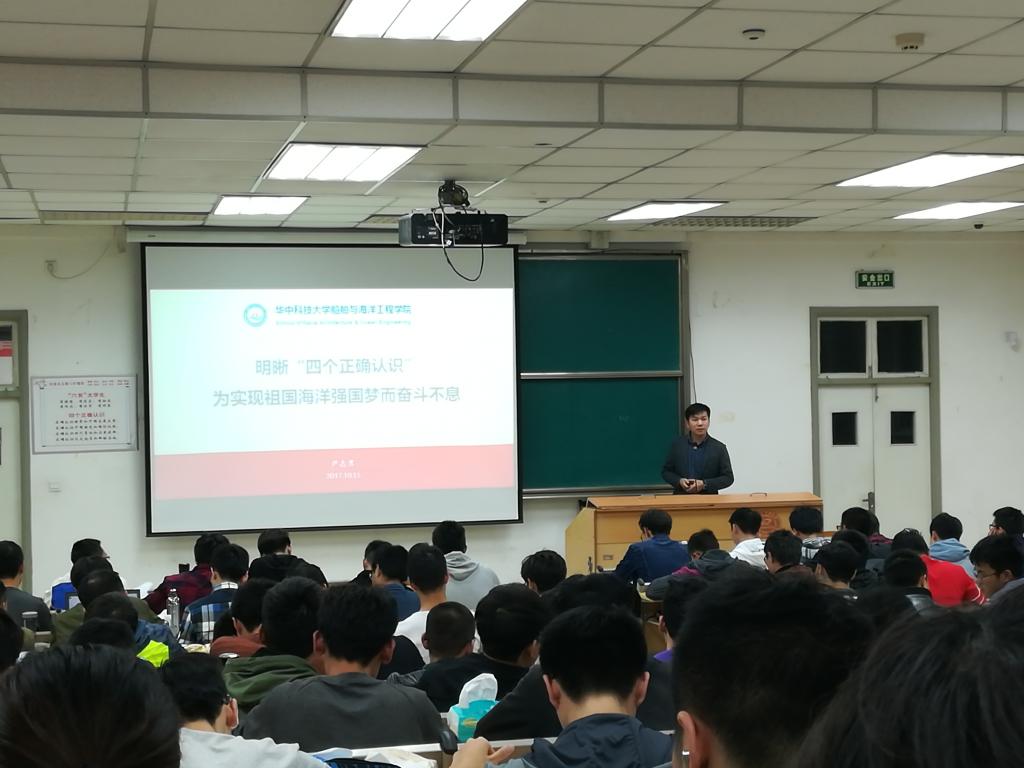 (通讯员 尹志男)“工科生为什么要上思政课”“怎么理解‘四个正确认识’”“习总书记七年知青岁月给我们有哪些启示”“海洋强国梦下的船海学子该怎样树立远大抱负”……10月15日晚7:00,bevictor1946韦德官网思政课面向全院1000余名研究生、本科生激扬开讲。公司党委副书记谢宇翔,辅导员李聪敏、尹志男、曹金梅以“明晰‘四个正确认识’,为实现祖国海洋强国梦而奋斗不息”为主题与同学们一起回顾砥砺奋进的五年,通过学习习近平总书记七年知青岁月的故事和身边优秀员工的成功事例,明确时代责任与使命。