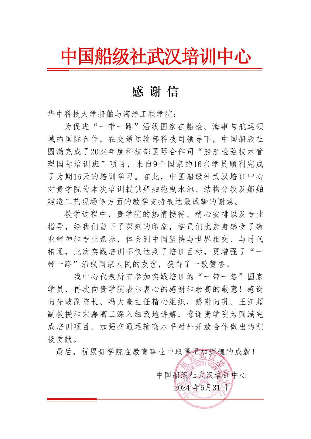 6月3日,公司收到来自中国船级社武汉培训中心的感谢信。