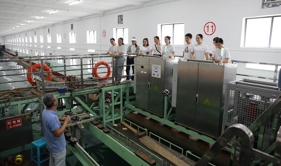 最后,来宾老师登上拖车系统体验拖车在水池上平稳行驶过程;同时造波机生成规则波模拟水面波浪,教师代表们细致观测波浪的水面起伏与传播过程,加深了对水池实验室的功能的了解。