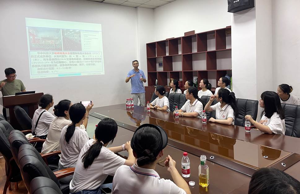 首先,宋磊老师在船池会议室针对船模拖曳水池实验室的主要功能参数开展讲解,并演示了部分依托水池开展的典型试验案例,来宾老师对水池实验室的功能使用形成初步认识。