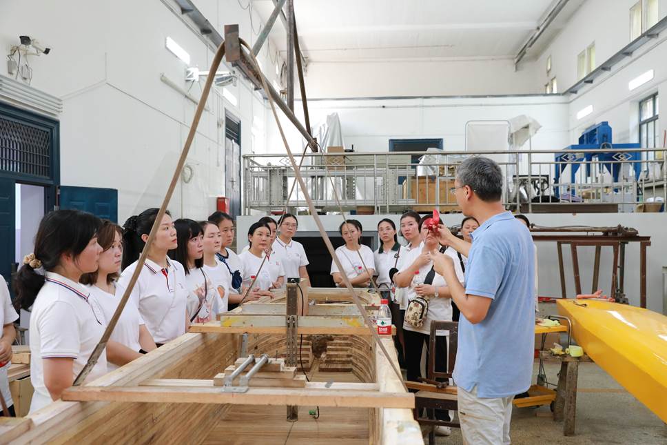 然后,冯大奎老师带着来宾老师在船模分段实验室开展参观舰船模型、船体分段等,来宾老师们通过船体局部结构分段、舰船内部结构透视模型等了解了船舶外壳之下的“支撑”,加深对船舶结构设计等的理解。