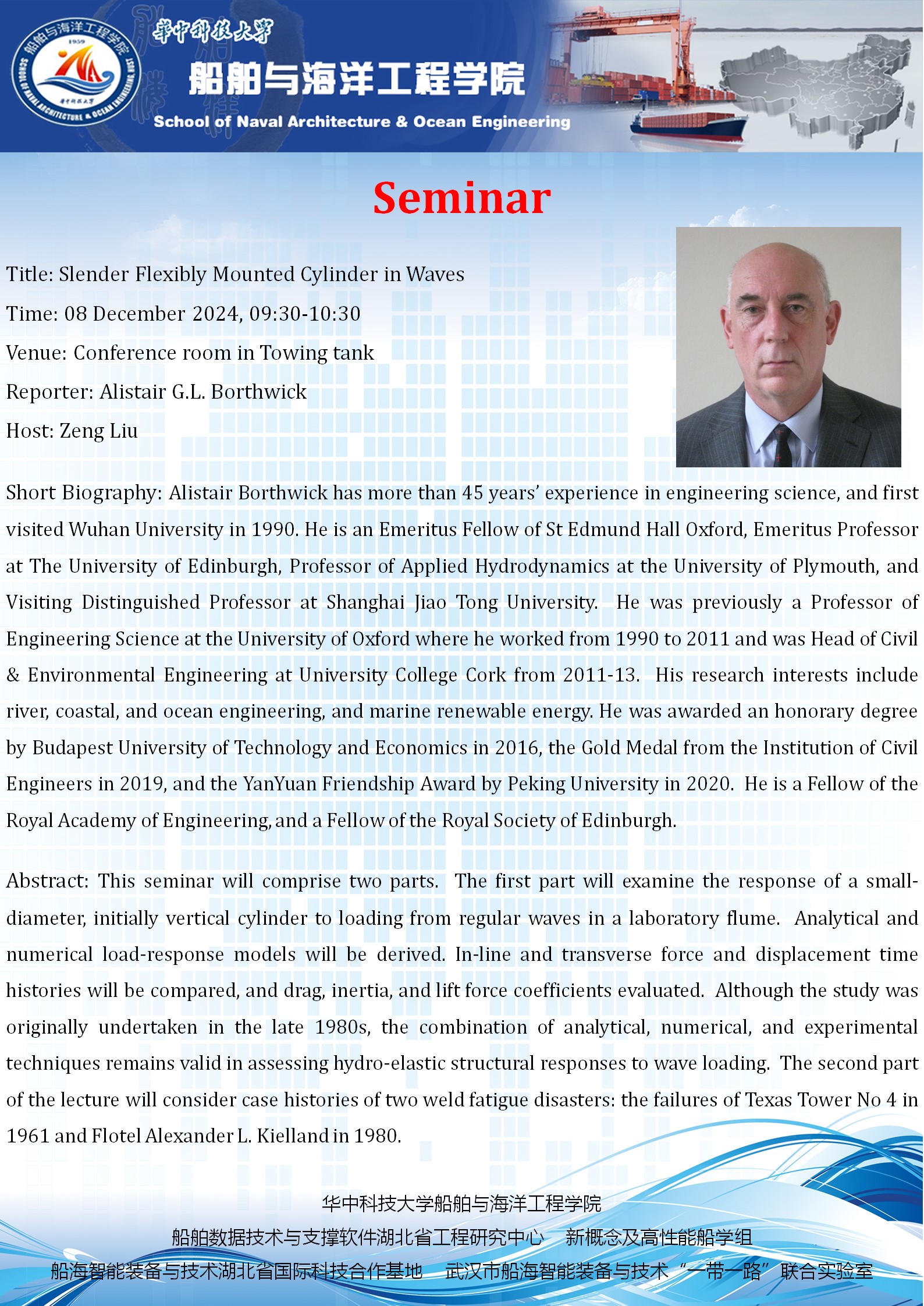 2024年12月8日上午,应刘曾副教授邀请,英国皇家工程院院士、爱丁堡皇家学会院士、爱丁堡大学名誉教授、牛津大学荣退教授Alistair G.L. Borthwick教授到访公司,并在拖曳水池会议室作题为《Slender Flexibly Mounted Cylinder in Waves》的专题讲座。此次活动由刘曾副教授主持,公司师生代表参加交流。