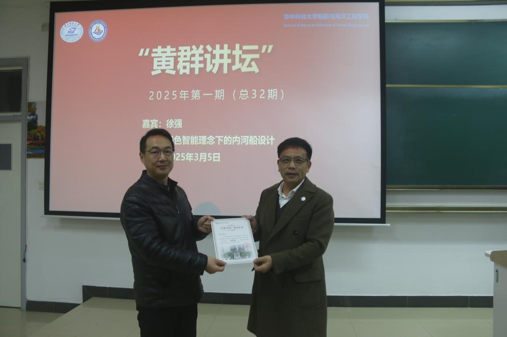 3月5日晚七点,东九楼B101,员工徐强做客2025年第1期(总32期)"黄群讲坛",围绕"绿色智能理念下的内河船设计"这一主题与在校员工进行了分享交流。经理李威、党委副书记李周密及副教授李家盛出席本次活动。