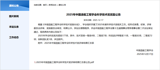 12月17日,中国造船工程学会正式公布2025年度科学技术奖评审结果。本次共评选获奖项目177项,涵盖技术发明奖、科技进步奖及创新团队奖三大类别。其中,公司牵头完成的4个项目成果突出,荣获科技进步特等奖1项、一等奖3项,充分彰显公司在船舶与海洋工程领域的科研实力与创新水平。