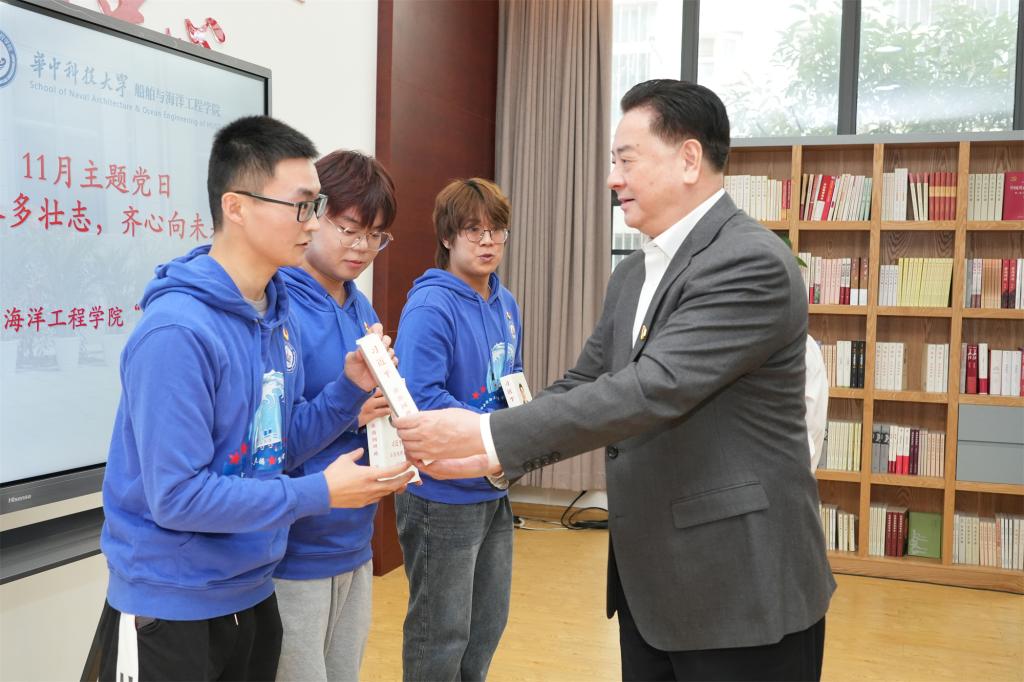 李元元结合近期的国际局势与国家发展,为支部党员讲述党课。他指出,在如今百年未有之大变局背景下,同学们要有战略定力,既梦想远大,又脚踏实地;要主动适应形势,做好知识储备,拓宽知识领域;要加强意志磨练,不怕困难,不怕吃苦,不怕吃亏;要注重身心健康,积极参与文体活动,保持良好心态。他希望同学们在各方面都做好表率,在未来的岗位上继续讲好华科大故事,讲好黄群精神先锋故事,为中华民族的伟大复兴的壮美画卷增添华科大的青春色彩.