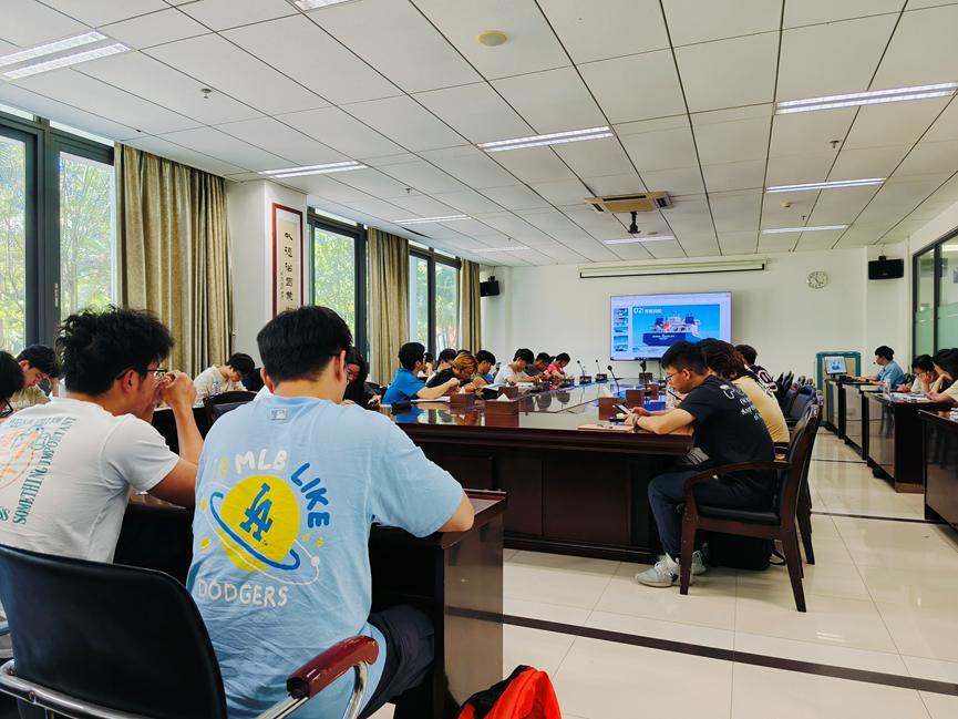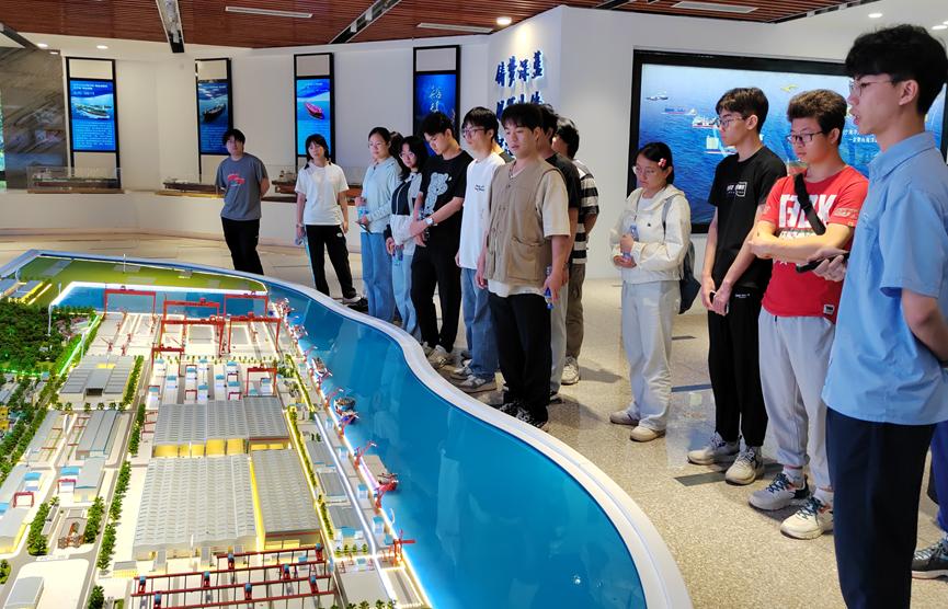 在广船国际有限公司南沙厂区,同学们在带领下有序分批参观了公司的展厅,对公司的发展历史、广船人不懈奋斗精神有了深入认识。随后,同学们结合建造现场先后完成了产品设计流程、生产建造流程、典型船舶介绍、激光复合焊工艺、造船质量管理等课程学习。最后,同学们与员工进行了深入交流。船舶工程专业1988届员工、正高级工程师聂众为同学们讲述了船舶生产建造流程,并寄语同学们学好专业知识,扎根船舶与海洋事业;轮机工程专业2017届员工、技术中心某室副主任李浩东为同学们介绍了广船国际建造的各型号典型船舶特点,并和同学们分享了工作经历,激励同学们心系国家事、肩扛国家责。