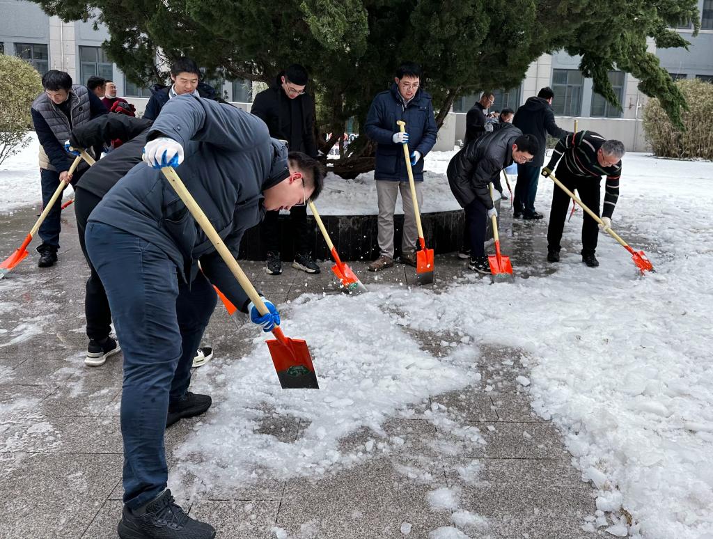 尽管前一天的行人踩踏和夜间的低温使得公司的出入口及主要通道地面覆盖了一层厚重的冰,大大增加了铲雪除冰的难度,但大家并肩作战,不畏艰难。通过撒盐、敲打、以及用开水浇灌等多种破冰方法,经过将近两个小时的不懈努力,终于将公司的中心通道清理得干干净净。在这片冰雪覆盖的世界中,大家勤奋工作的身影成了一道美丽的风景线。