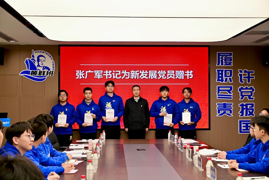 张广军为支部新发展党员赠送书籍《百年党史——决定中共命运的关键抉择》,鼓励他们加强党史学习,坚定理想信念。