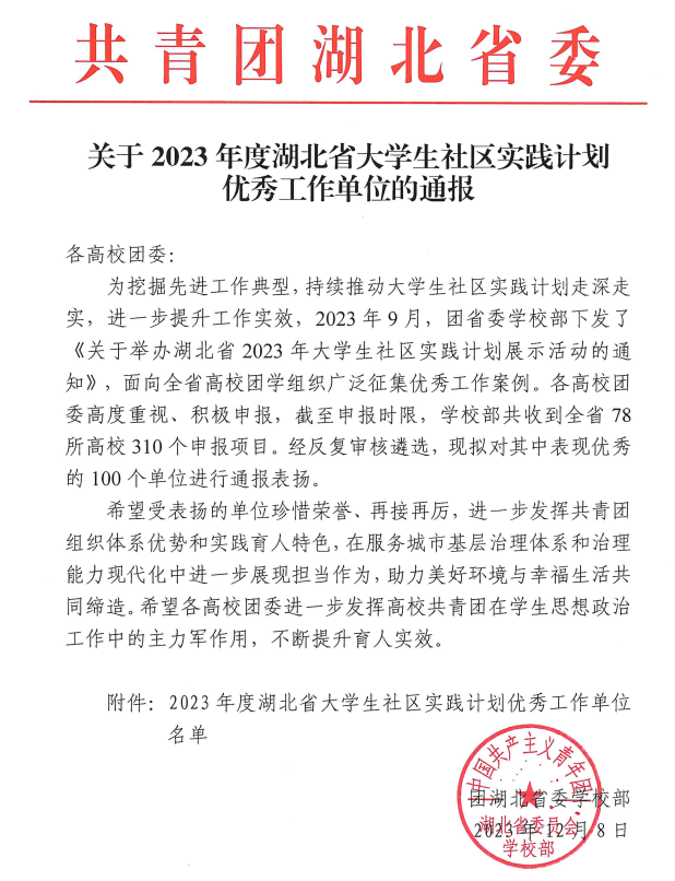 (通讯员:张石磊)2023年12月8日,共青团湖北省委公布了2023年度湖北省老员工社区实践计划优秀工作单位名单。bevictor1946韦德官网bevictor1946韦德官网团委名列其中。