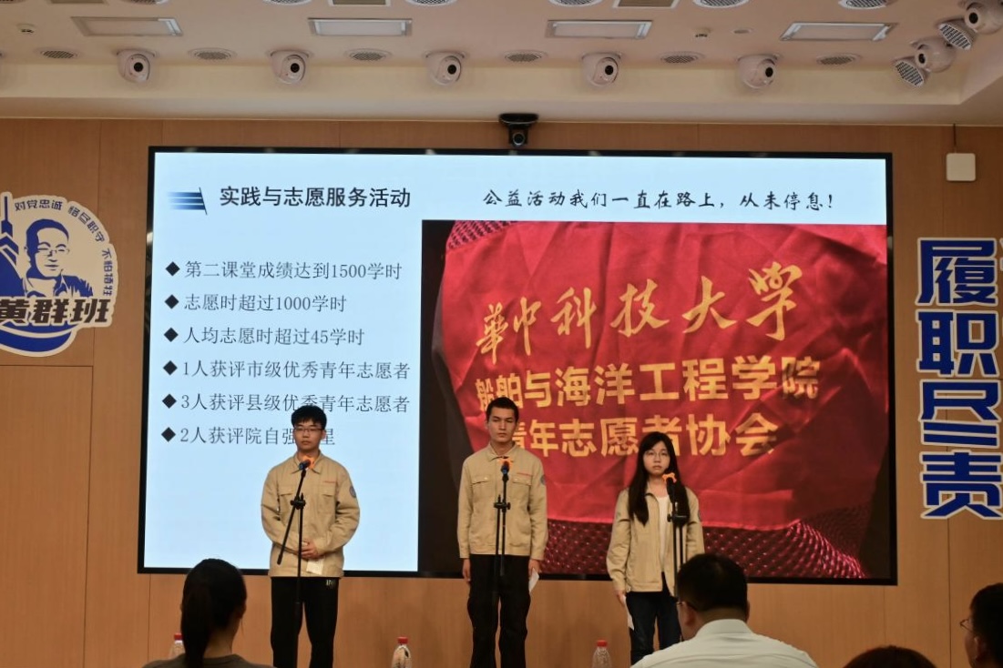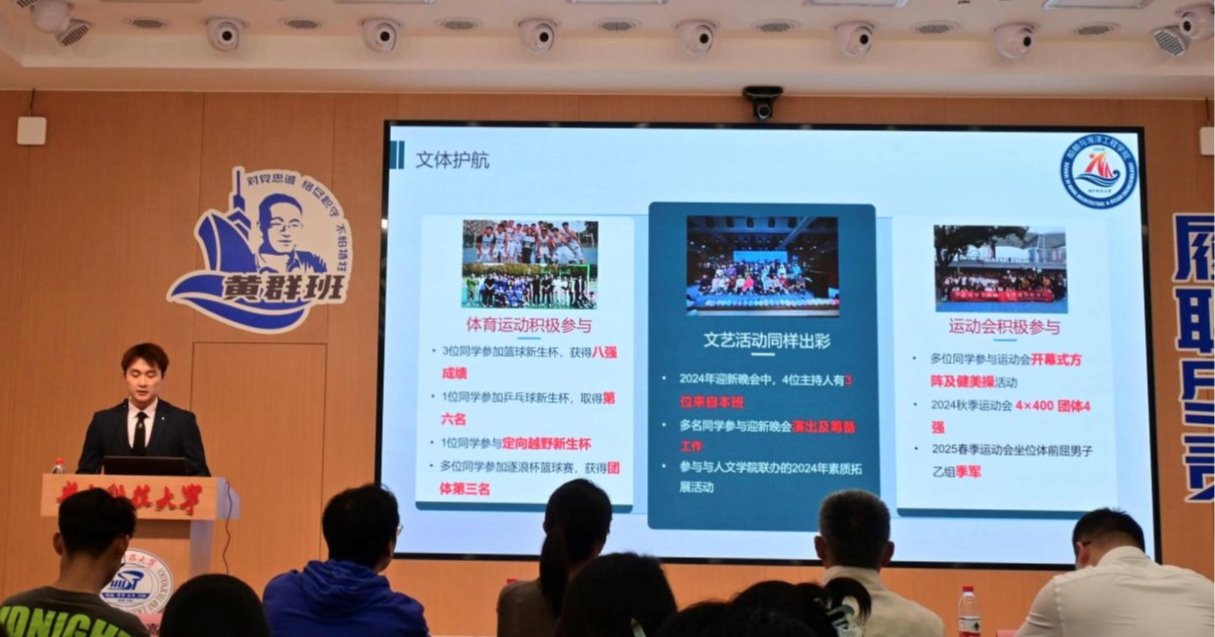 船海2403班的风采汇报中展示了班级始终以学习和实践等各个方面的建设目标展开——从学习帮扶小组的成立、志愿服务活动的定格瞬间、企业社会实践合影,到横幅上“黄群携手航远海,众智同心绘锦程”的醒目誓言、班级合唱的《夜空中最亮的星》中的“请指引我 靠近你”,每一处细节都在诉说着同学们在学习与实践中的扎实足迹,每一次努力都成了船海2403班同学们逐梦路上最生动的注脚。