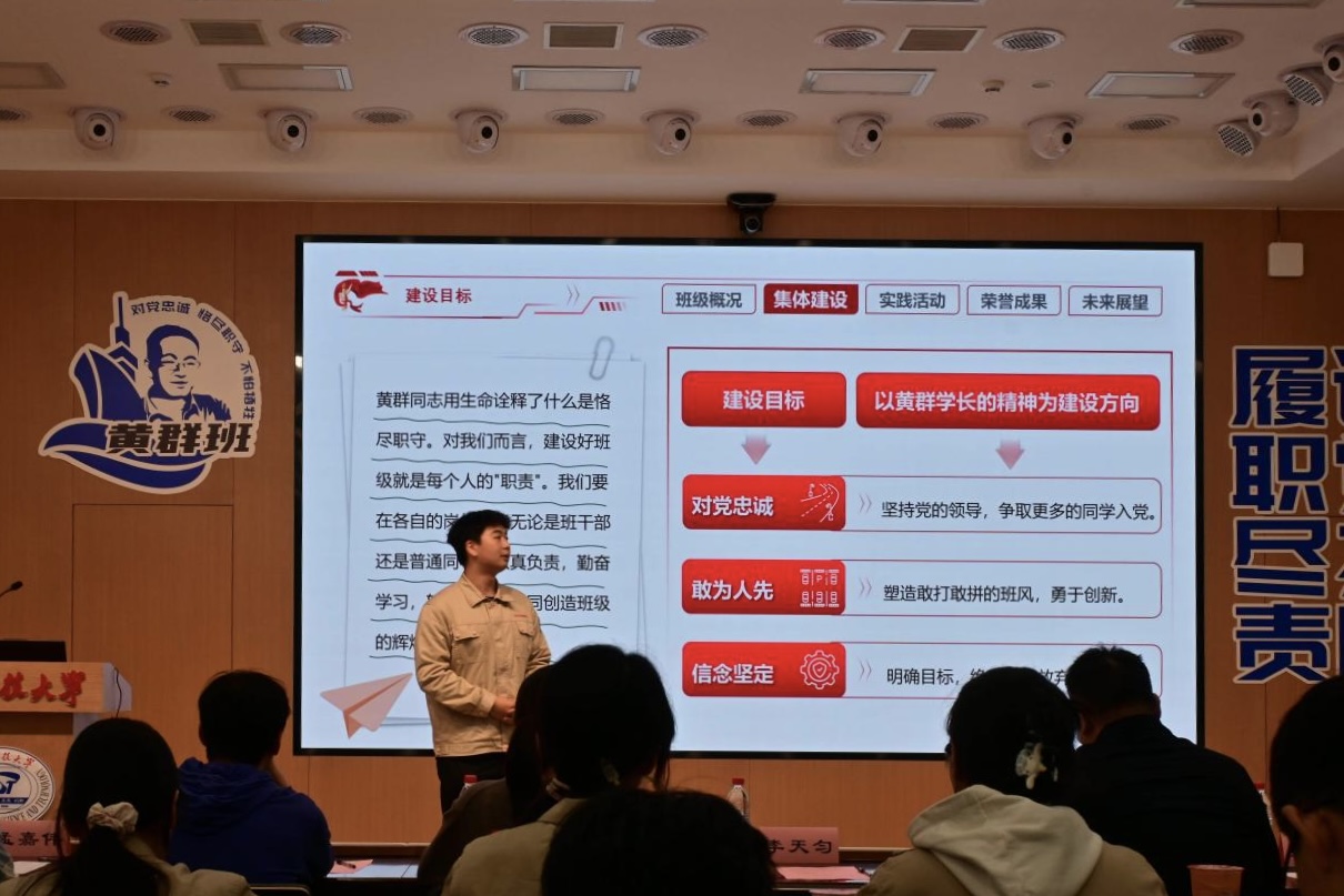 船创2401班的风采展示,生动描绘了集体成长的坚实底色。他们展现出严谨的班级制度,系统性地展示了诸如晚自习打卡、作业清点等行之有效的条规,这不仅是日常管理的框架,更是培育优良学风的有力手段。在此基础之上,班级内形成了勤学笃行、互帮互助的浓厚氛围,同学们在学习道路上结伴同行,共同进步。展示的尾声,班级全体同学共同登台,以一首深情而坚定的原创歌曲作为结尾。悠扬的旋律中,满载着对黄群学长的深切追思与崇高敬意,激昂的歌词里更唱响了新一代青年接续奋斗、矢志报国的远大理想。